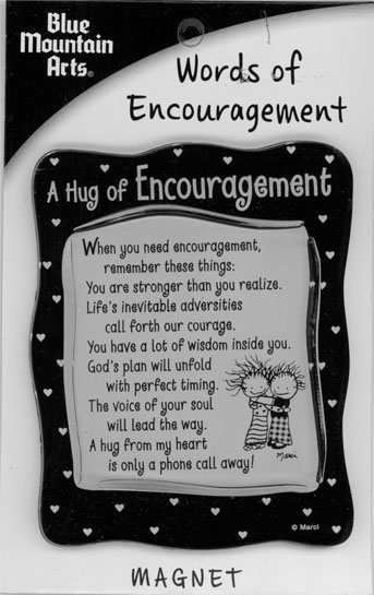 When you need encouragement, remember these things: You are stronger than you realize. Life’s inevitable adversities call forth our courage. You have a lot of wisdom inside you. God’s plan will unfold with perfect timing. The voice of your soul will lead the way. A hug from my heart is only a phone call away!
